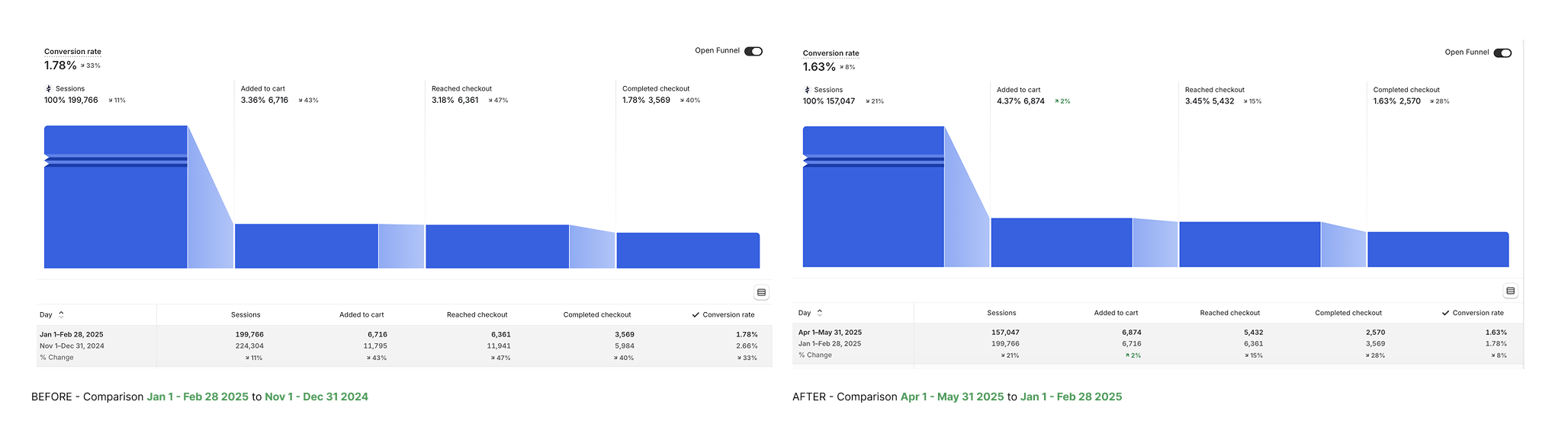We also see that Reached Cart checkout increases slightly as well from 3.18% to 3.45% indicating that the redesign improved product discovery and purchase intent. However we do see the conversion drop at Completed Checkout. It is important to note the macro factors including external economic pressure (tariffs, consumer spending pullback in spring 2025 were well-documented) and reduced overall traffic volume from a quieter seasonal period.
