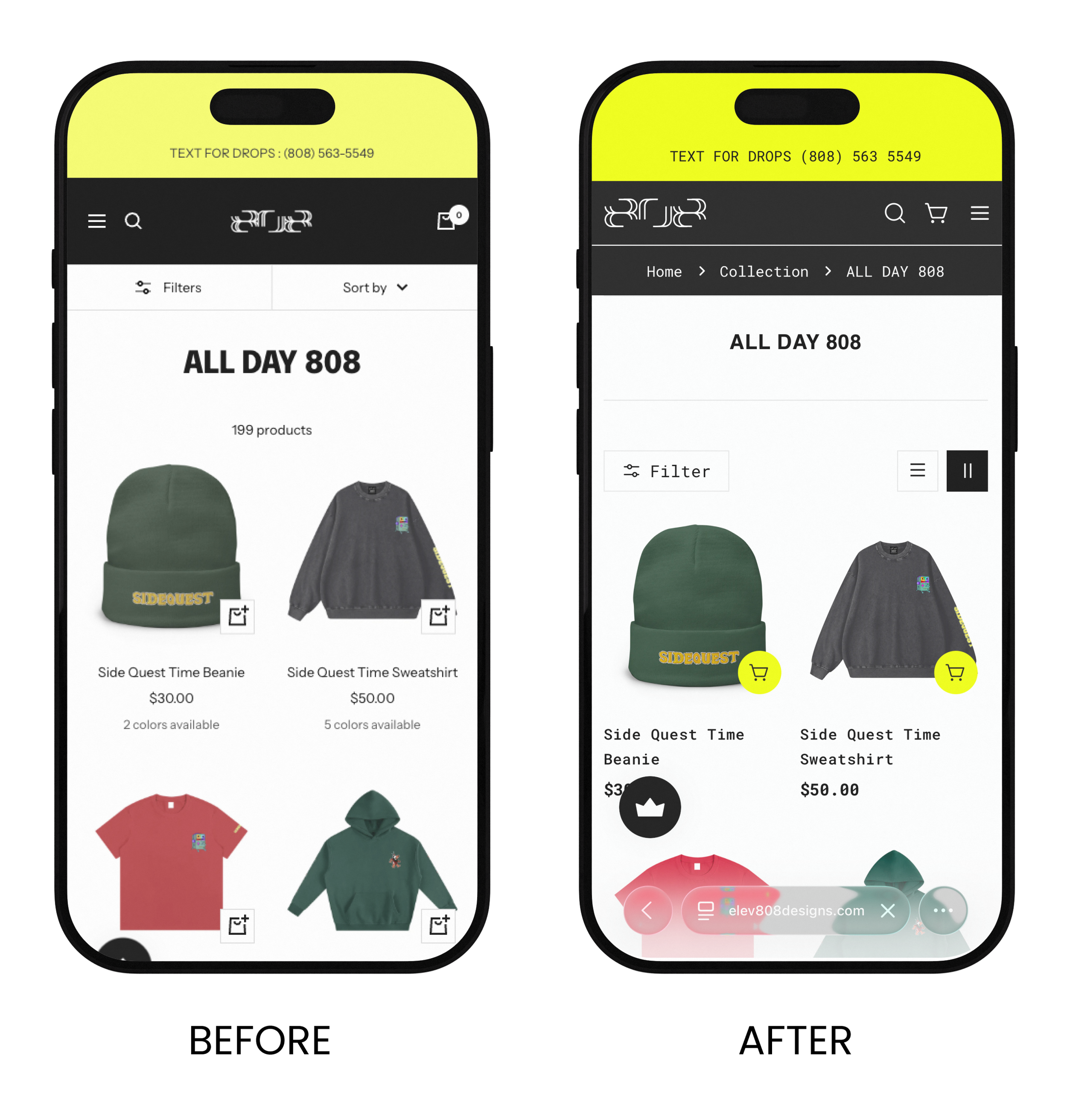 As Elev808 expanded their product catalog beyond its core sports apparel offerings, the storefront required a structural lift. This included new page templates, expanded collections, and a more scalable site architecture to support a growing and more diverse product range. This expansion provided the opportunity to address additional underlying UX issues.