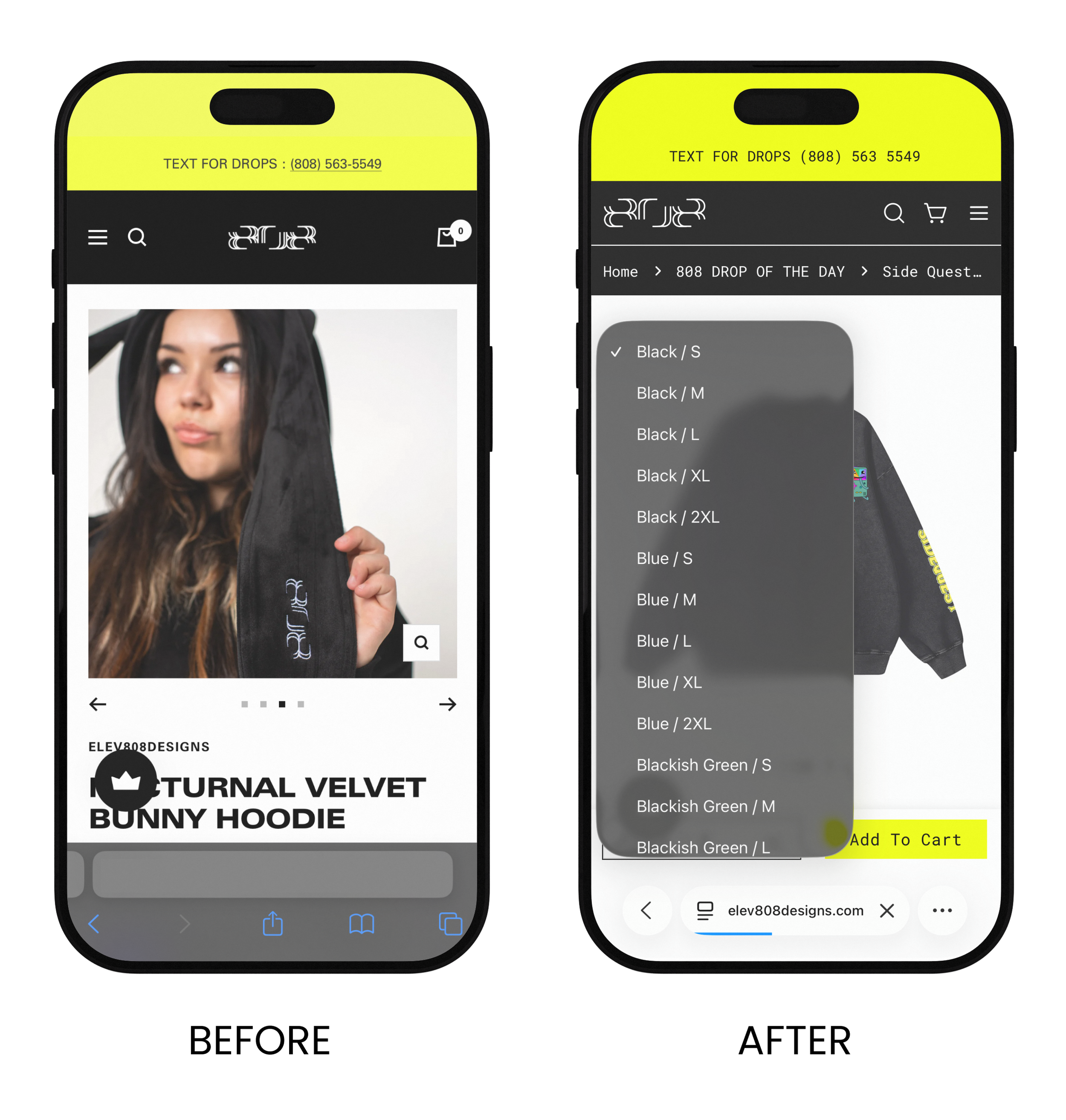 After: We introduced a sticky Add to Cart bar that remains visible as the user scrolls, ensuring the primary conversion action is never out of reach. We also restructured the information hierarchy so that pricing and variant selections appear before the product description, reducing cognitive load and shortening the path to purchase.